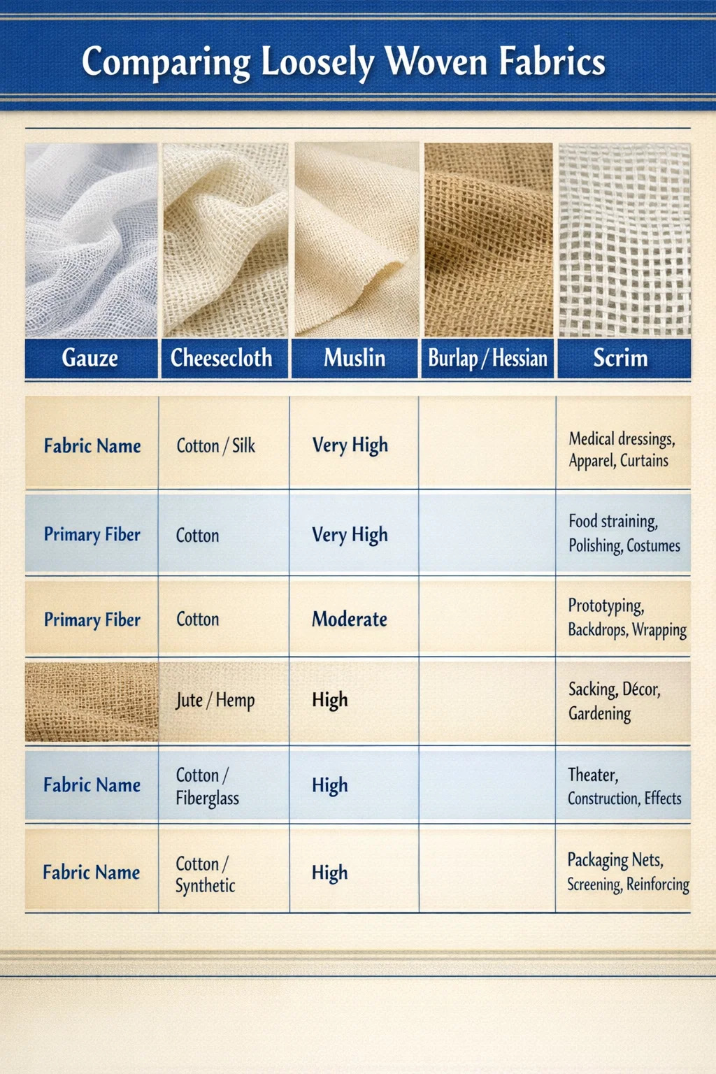 Cette structure ouverte n’est pas un défaut : c’est un choix d’ingénierie délibéré. Les tissus à tissage lâche sont appréciés pour leur respirabilité, leur légèreté, leur flexibilité et, dans de nombreuses applications industrielles, leur capacité de filtration. Comprendre exactement quel nom s'applique à quel tissu vous aide à sélectionner le bon matériau, que vous cousiez des vêtements, prépariez de la nourriture, décoriez des intérieurs ou travailliez sur un projet d'artisanat.