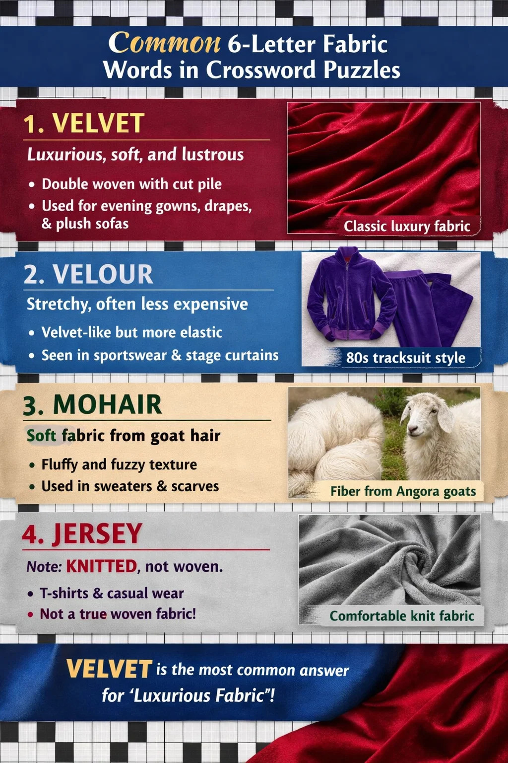 Dans les mots croisés, si l'indice décrit un mot de 6 lettres « luxueux, doux et velouté » tissu tissé , la réponse la plus classique est VELVET.