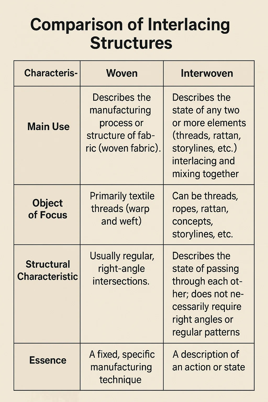• « Entrelacé » est un mot qui met l'accent sur l'action et l'état, et sa signification est plus large que « tissé », et ne se limite pas au tissu. Il décrit l’état de deux ou plusieurs choses entrelacées et étroitement mélangées.