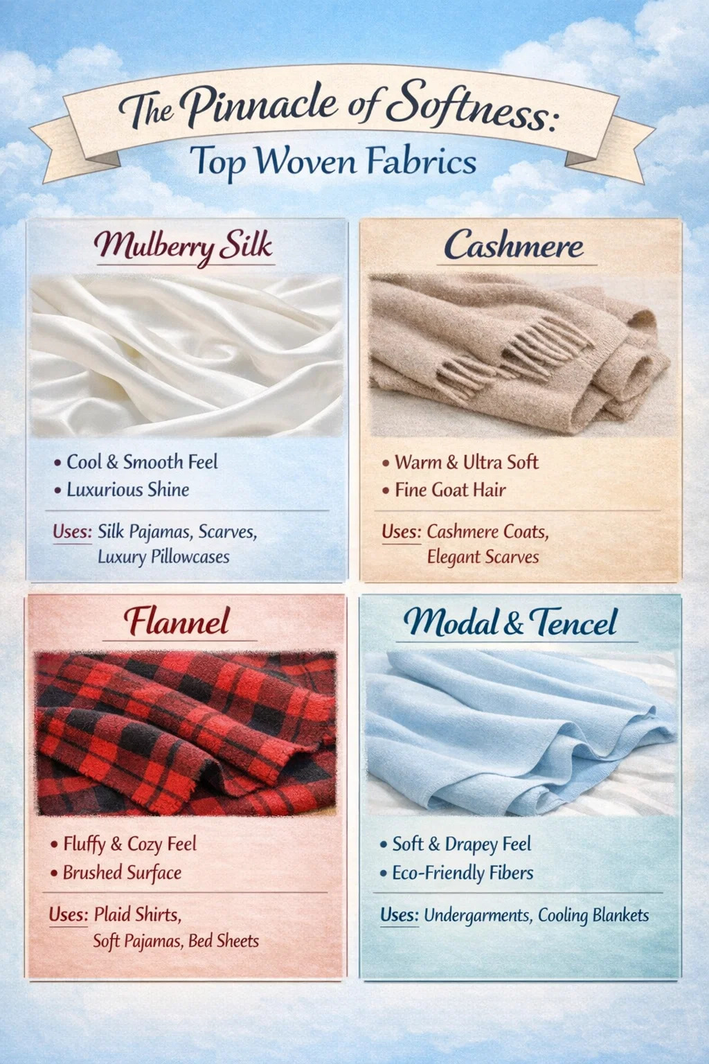 Quand il s'agit du "plus doux" tissus tissés , cela dépend vraiment du type de sensation que vous recherchez – qu'il s'agisse d'un duvet semblable à un nuage ou d'une douceur soyeuse.