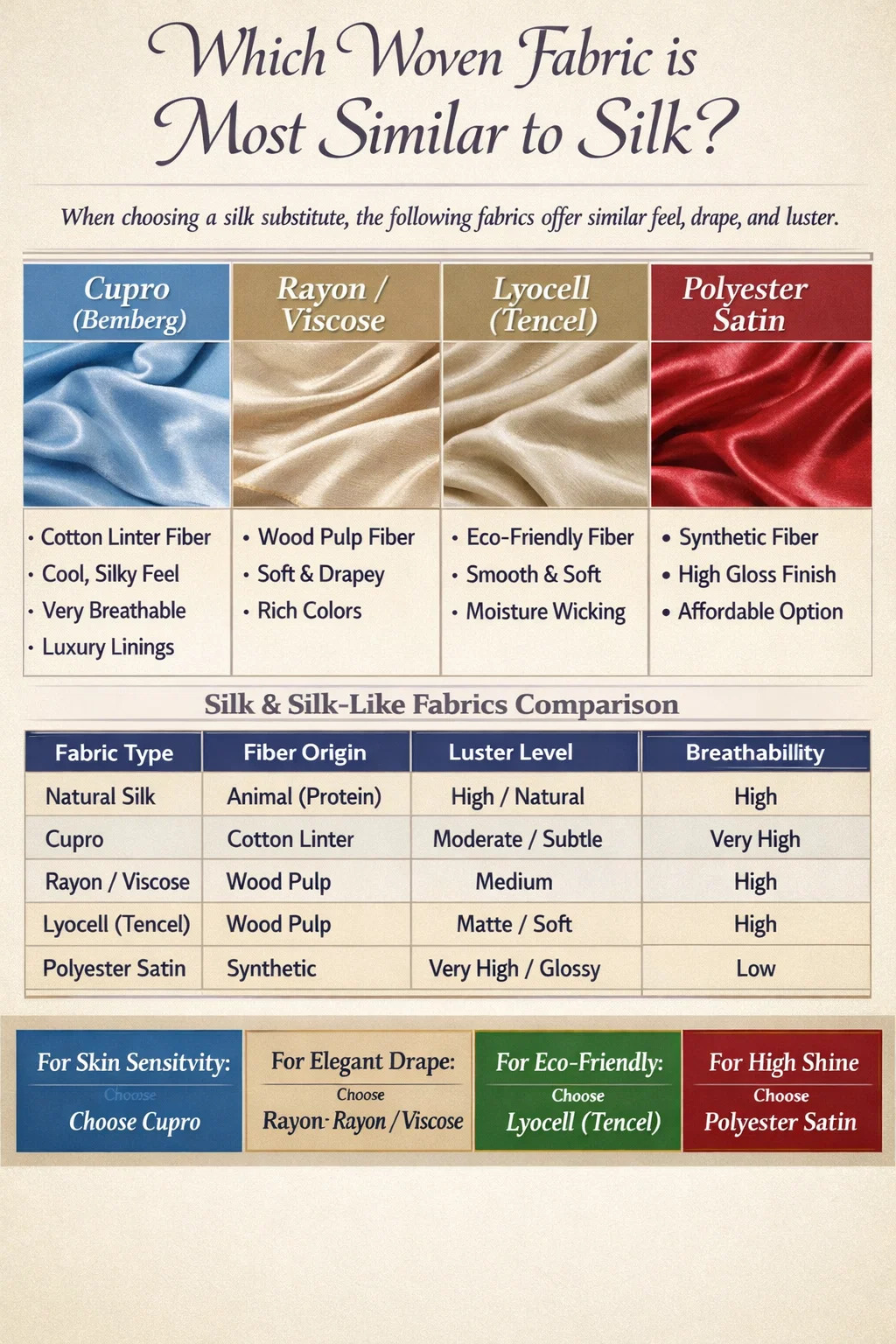 Lors de la recherche d'un tissu tissé qui reproduit la sensation luxueuse, le lustre et le drapé de la soie naturelle, les concurrents les plus importants sont Rayonne, Cupro et Lyocell (Tencel) . Parmi ceux-ci, Cupro est largement considéré comme le match le plus proche en termes de respirabilité et de toucher soyeux, tandis que Polyester satiné constitue l’alternative synthétique abordable la plus courante. Ces tissus utilisent des tissage techniques pour imiter les fibres protéiques lisses produites par les vers à soie.